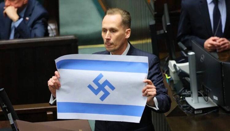 A far-right Polish lawmaker sparked widespread outrage after displaying a paper Israeli flag defaced with a swastika in parliament, accusing Israel of committing “genocide” in the Middle East. The Israeli embassy swiftly condemned the act as an “antisemitic horror.”